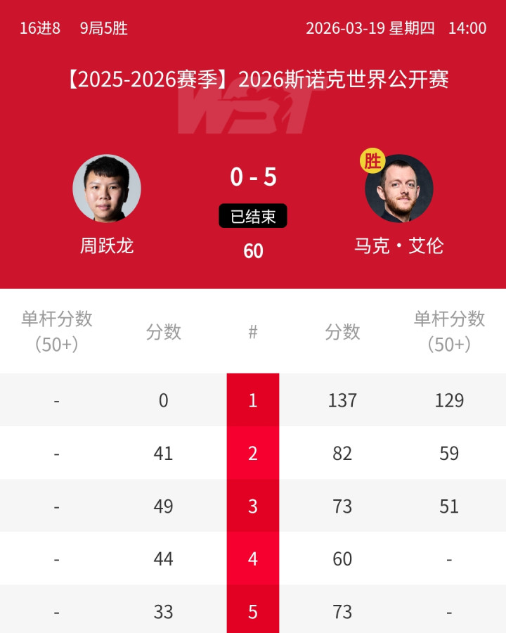 中国90后名将周跃龙与北爱尔兰“小钢炮”马克·艾伦的较量呈现出一边倒的态势。