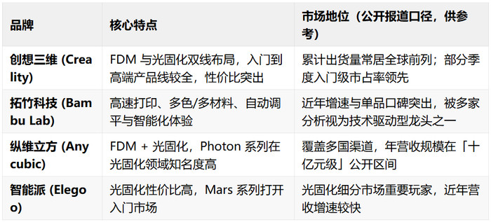 尤其是在深圳,中国最具着名度的四家公司——拓竹科技、创想三维、智能派、纵维立方,被称为深圳“四小龙”,合占全球初学级3D打印机九成市集份额。