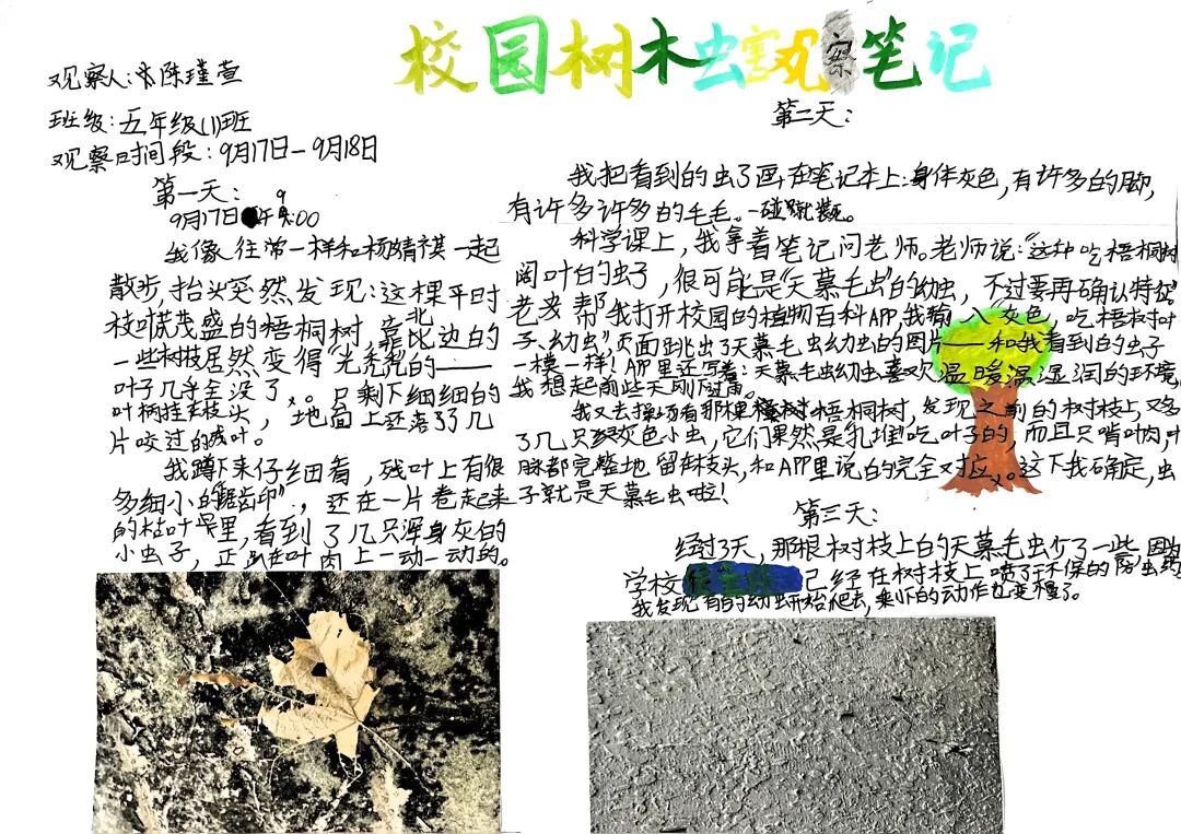 关于“校园树木保护小组”的成立,学生们先容,源于“一棵树的求救”。前年春天,学生们发现校园里的一棵梧桐树叶片出现了大批孔洞,枝干上也布满了玄色的毛毛虫。濒临树的“求救”,学生们在古道的携带下,开启了一场围绕“梧桐树枯萎原因及防治”的跨学科主题学习,并最终写出了一份防治提议。学校选拔了学生的提议,操纵周末期间对受侵害的梧桐树进行了药物喷洒。学生们将所有学习历程整理成《校园树木保护手册》,提交给学校智育处,并成立了“校园树木保护小组”。