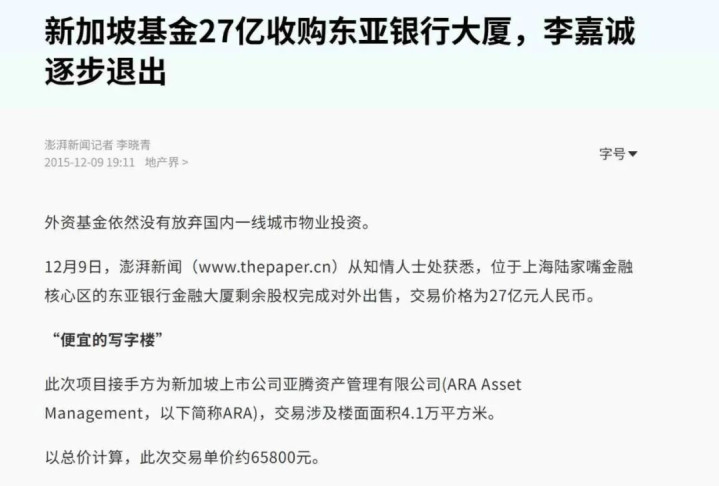 近日,多个市集音书称,东亚银行完成了对上海陆家嘴东亚银行金融大厦中枢办公物业的收购,来回意见为12-23层中枢办公楼层,来回总价16.8亿元,收购面积约4.2万泛泛米,折合单价约4万元/泛泛米。来回敌手为ESR旗下亚腾资产处理(ARA Asset Management,简称ARA),ARA在2015年购入相关物业,彼时媒体报谈的来回价钱为27亿元。