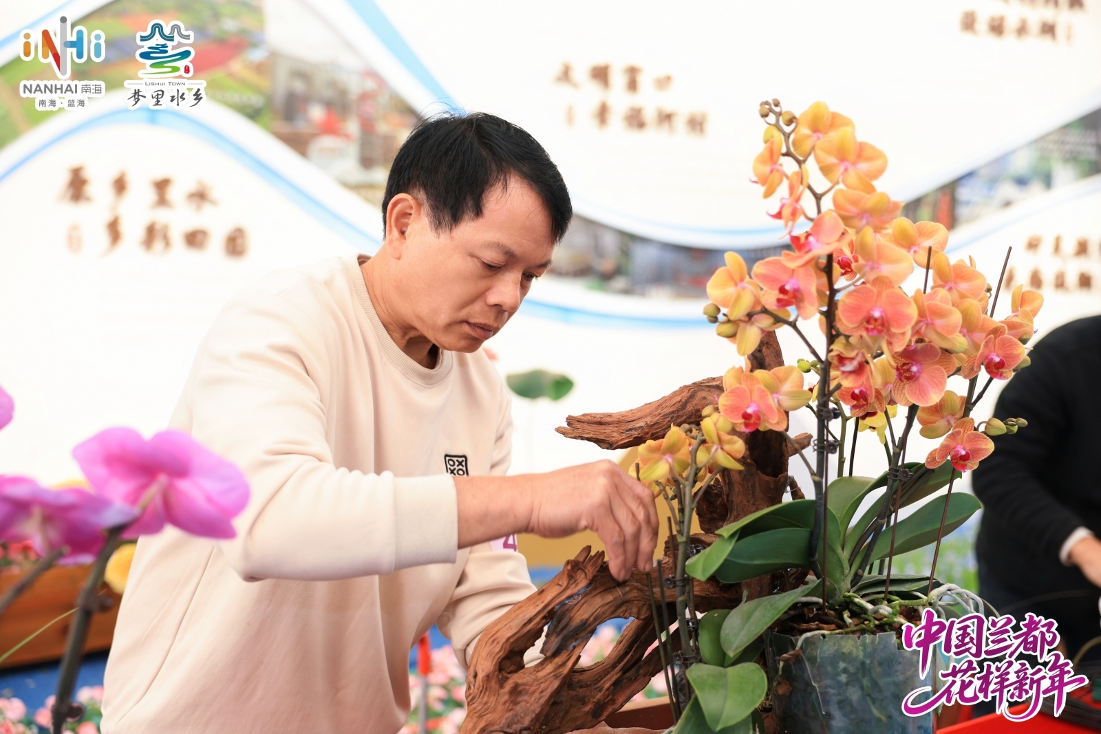 南海新春,先闻兰香。1月16日,广东万顷园艺世界内,数十位园艺高手正专注地进行蝴蝶兰创意组盆大赛。一株株蝴蝶兰在巧手搭配下,从栽种农家具变成富含文化寓意的艺术作品,也成了南海向外界传递的一张高水平农业柬帖。