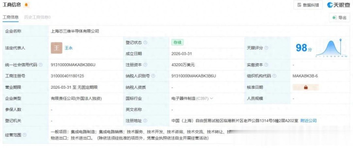 4 月 1 日工商信息显现,中芯海外全资修复上海芯三维半导体有限公司,注册成本4.32 亿好意思元(约 29.75 亿元东谈主民币),法定代表东谈主王永。